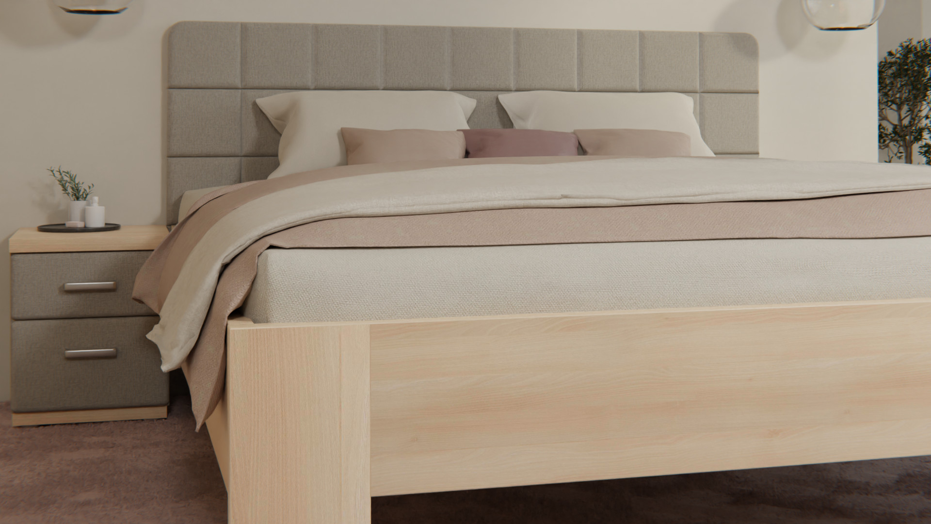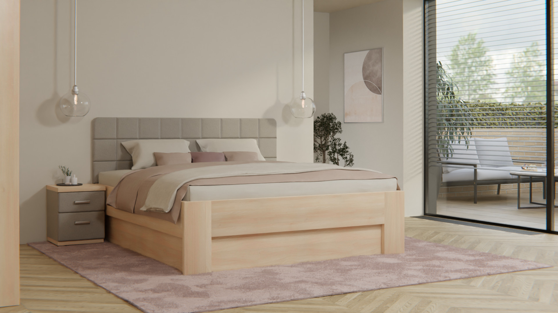 • Prošívané čalouněné čelo a moderní design pro originální vzhled ložnice.