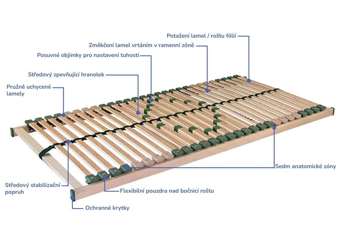 • 7 anatomických zón s pružnými lamelami uloženými ve dvojitých kaučukových pouzdrech.