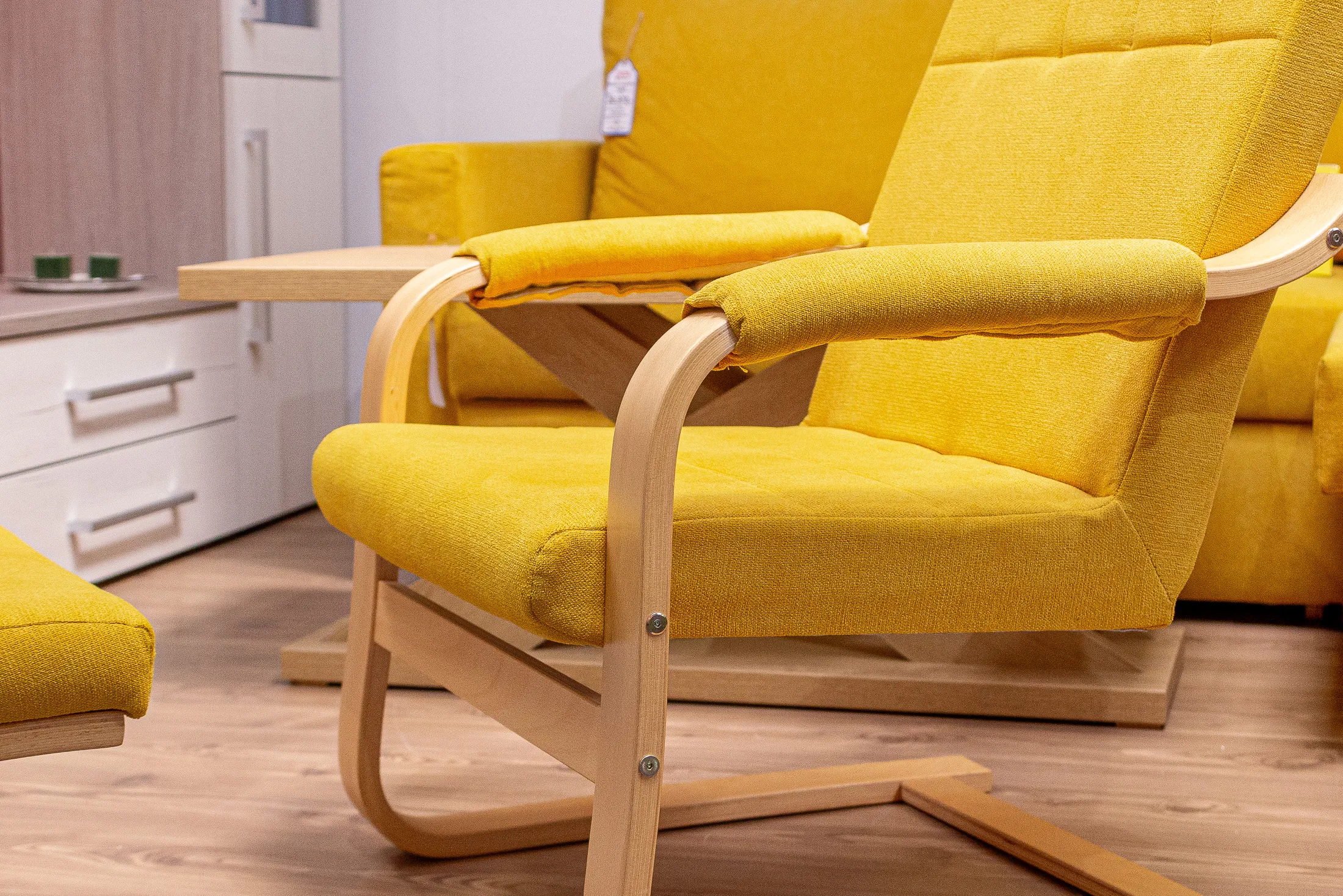 Lehký pohupovací design – elegantní konstrukce umožňuje jemné houpání díky pružné kovové kostře spojené s lamelovanými dřevěnými područkami zakřivenými do oblouku